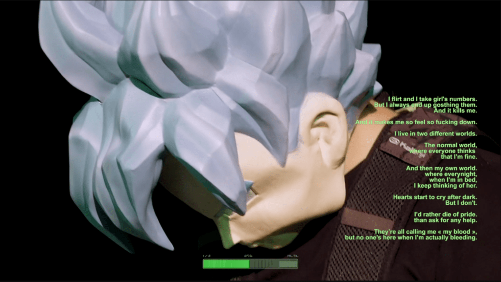 S.S. : Cool. Du coup c’était que du spontané. Ca se trouve la matière que j’allais avoir allait être naze dans le sens où ça allait pas être sensible comme moi je l’imaginais. En fait – c’est peut-être un peu abusé de dire ça – moi je le trouve trop beau ce film parce que j’ai réussi à avoir des trucs que j’aurais même pas espéré. C’était un challenge de ouf mais à la fin je suis trop heureuse. La troisième étape ça a été le jeu vidéo avec la voix de Idir Azougli, l’acteur de Shérazade notamment mais qui a fait plein d’autres choses après, et qui est marseillais. Pendant le confinement, j’ai rencontré virtuellement un jeune homme suisse de 20 ans et il se trouvait dans la position exacte du personnage que j’avais créé qui était un mec qui allait demander la main de sa copine à son père. On a discuté pendant tout le confinement, il me faisait plein d’audios, il me racontait comment ils s’étaient rencontrés, comment ça s’était passé, le fait d’avant lui demander sa main il voulait “devenir un homme” pour être sûr de lui, avoir confiance, être prêt à savoir ce qu’il pourrait offrir à sa fiancée. Il m’a fait plein d’audios pour me racontaient ça et moi de mon côté j’ai écrit les monologues avec ses audios un peu retravaillés.